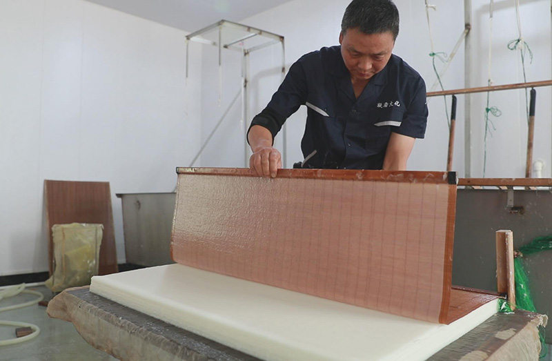 徽州傳統(tǒng)手工楮皮紙,采用傳統(tǒng)手工抄紙工藝,經(jīng)過(guò)27道工序,以手工精細(xì)制作而成,產(chǎn)品主要有楮皮紙、云龍紙、皺紋紙、落水紙、棉紙、版畫、攝影畫、手撕畫專用紙。 生產(chǎn)工序: 浸泡—→腳踏—→清水蒸煮—→切料—→石灰漿浸泡—→蒸煮—→自然漂洗—→腳踏