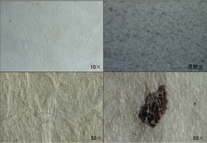 構(gòu)皮纖維雖不及麻纖維那么長,但遠(yuǎn)長于竹纖維,一般在5-10mm 左右。由于構(gòu)皮本身具有一定的白度,纖維素含量也比較高,因此構(gòu)皮紙成紙白度一般要高于麻紙和竹紙,構(gòu)皮紙質(zhì)地較麻紙綿軟,韌性好,常被稱為“白棉紙”,亦有“蟬翼”、“冰肌”等雅喻。構(gòu)皮紙紙面的勻度和平滑度一般介于麻紙和竹紙之間,由于蒸煮過程中用到草木灰,構(gòu)皮紙一般潔白中略偏灰色,紙面纖維在光線照射下會泛出絲質(zhì)光澤。由于纖維較長不易分散,成紙內(nèi)常見有未打散的纖維束,形態(tài)蜿蜒曲折,兩端多散開呈絮狀(如圖1 左下)。構(gòu)皮紙?jiān)诖娣乓欢螘r間之后,紙面常見有零星的淺銹黃色暈點(diǎn)狀氧化斑,曾有文人墨客因此雅稱其為“桃花紙”。另外,手工抄造的構(gòu)皮紙?jiān)诶w維間還常會殘留一些構(gòu)皮外皮的黑灰色碎屑,這也是構(gòu)皮紙的一個特征(如圖1 右下)。